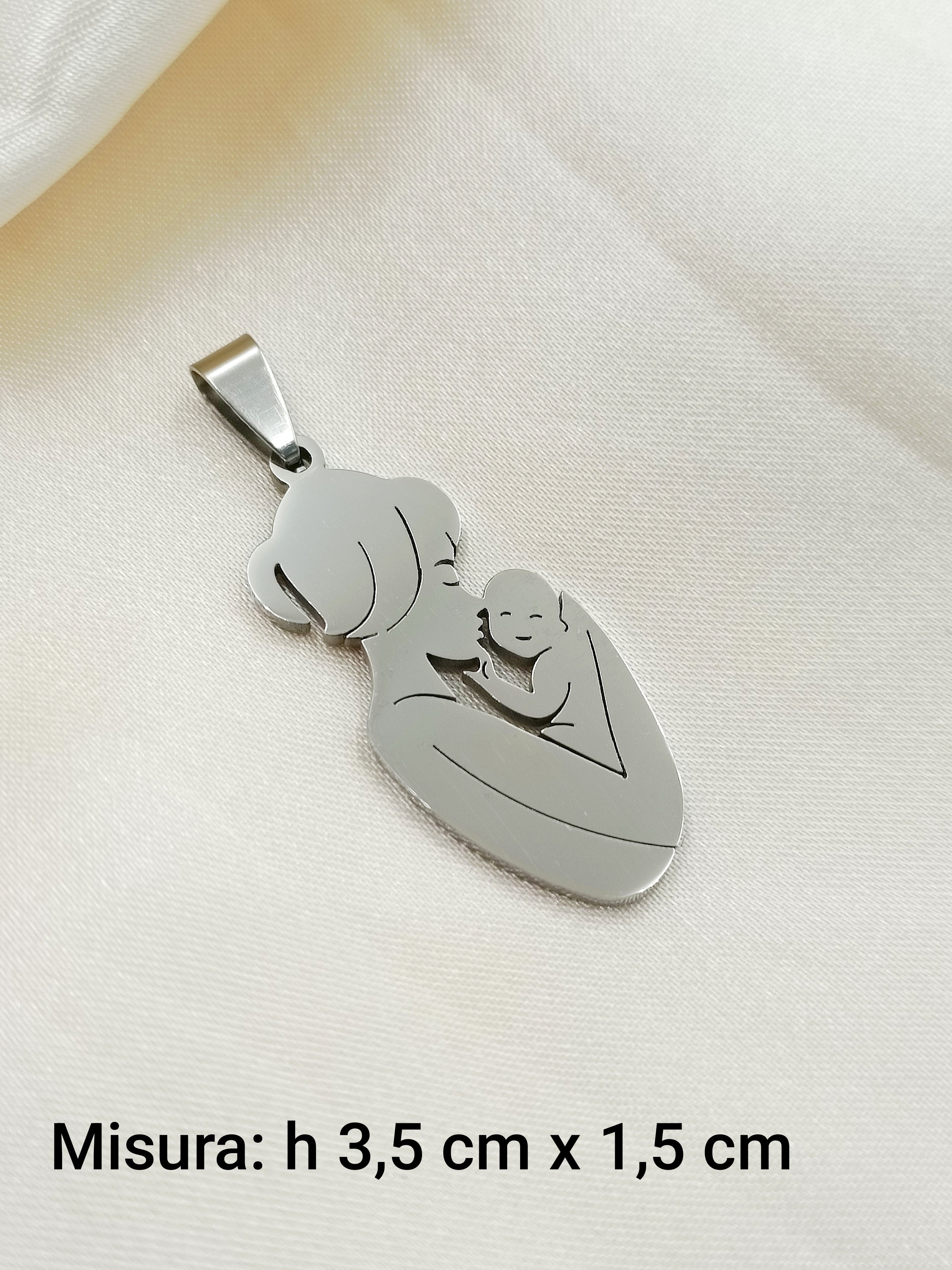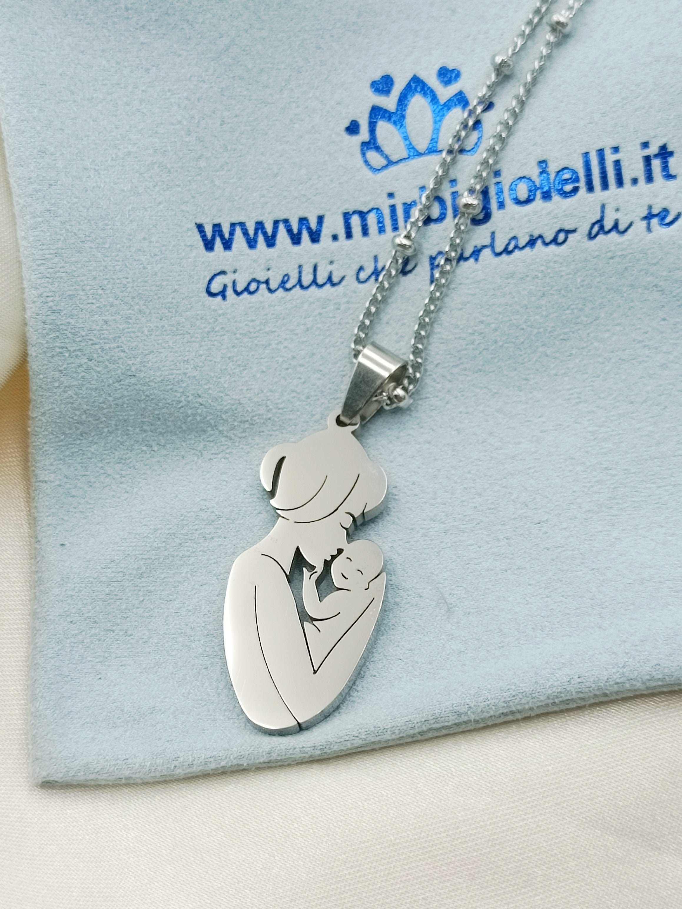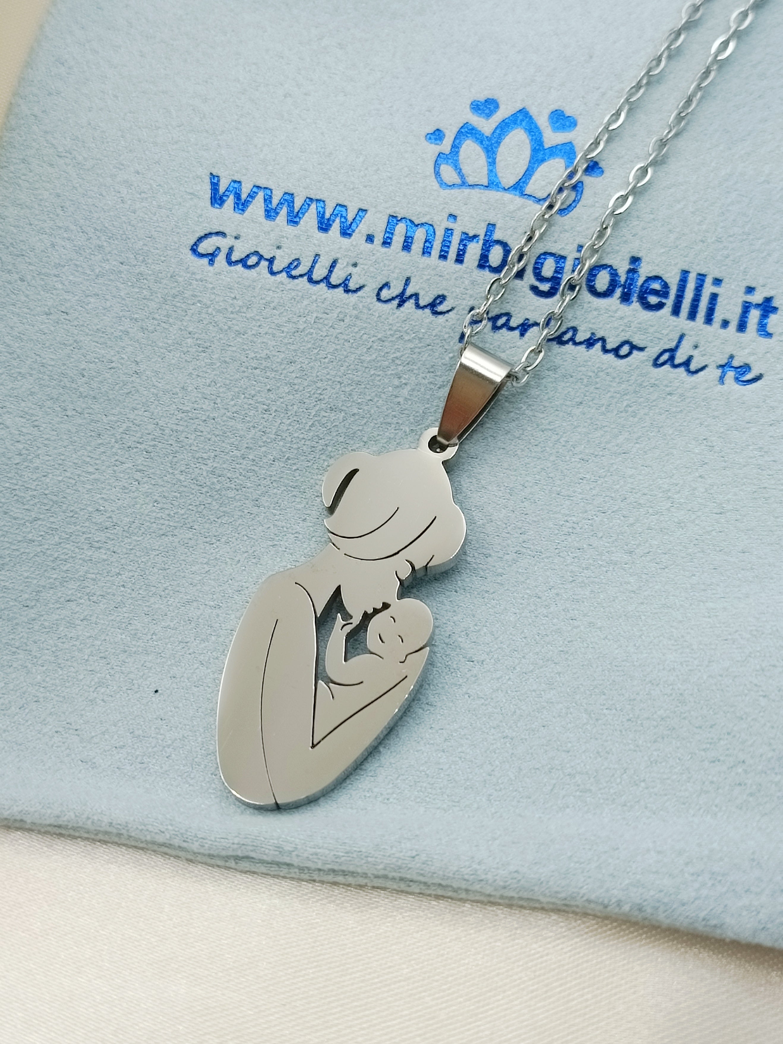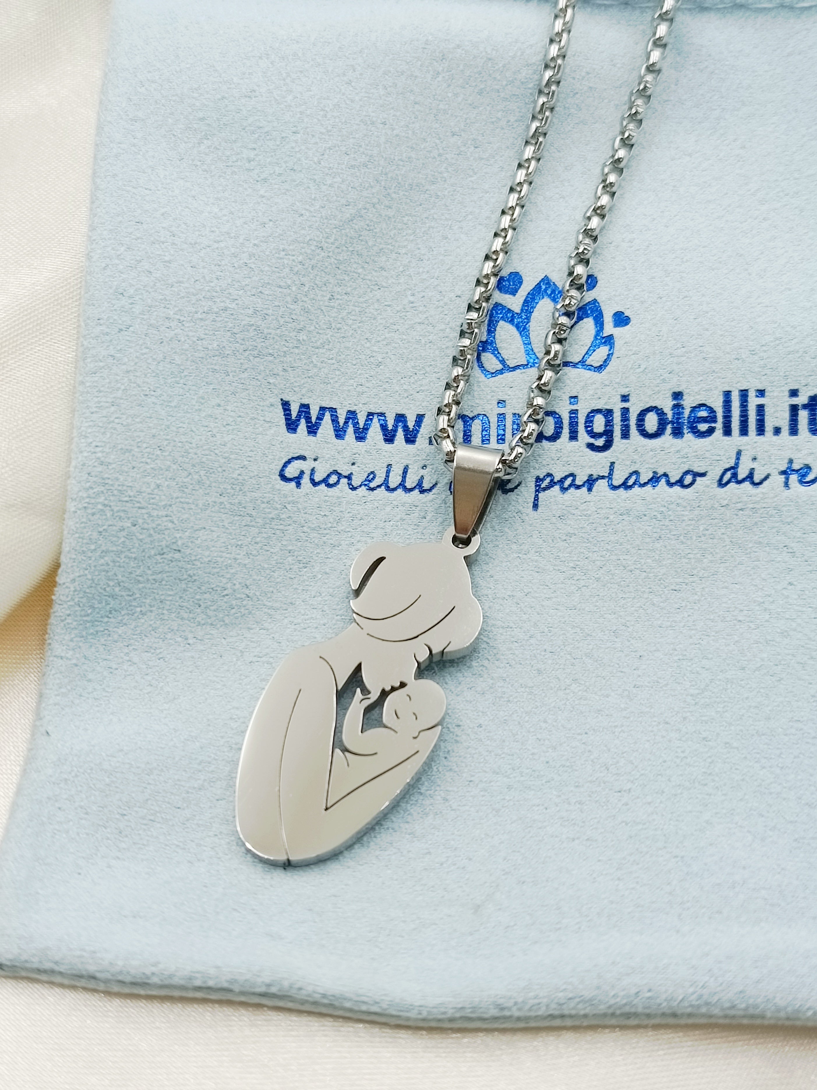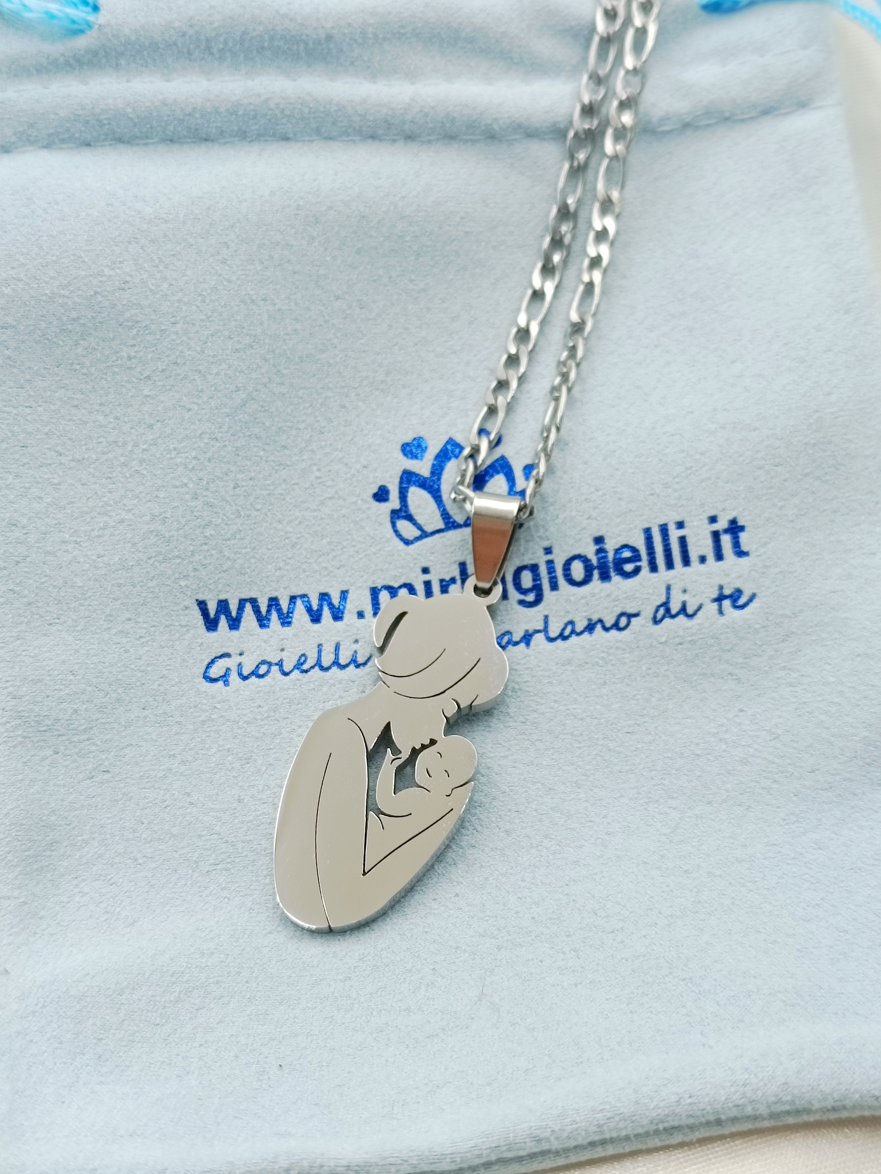 Collana con mamma e bimbo in acciaio inossidabile e anallergico, personalizzabile con incisione: puoi scrivere nelle note del carrello ciò che desideri incidere.