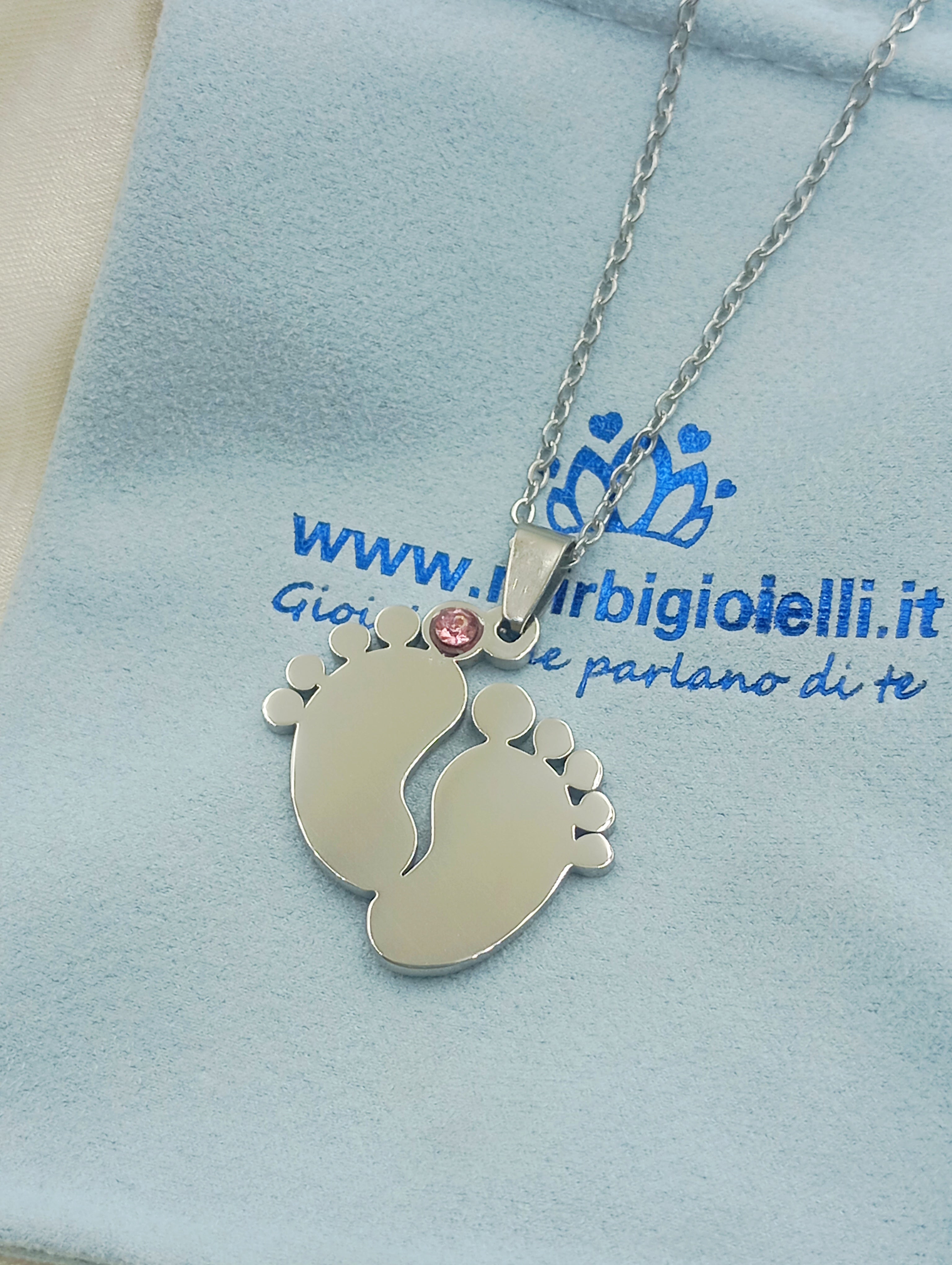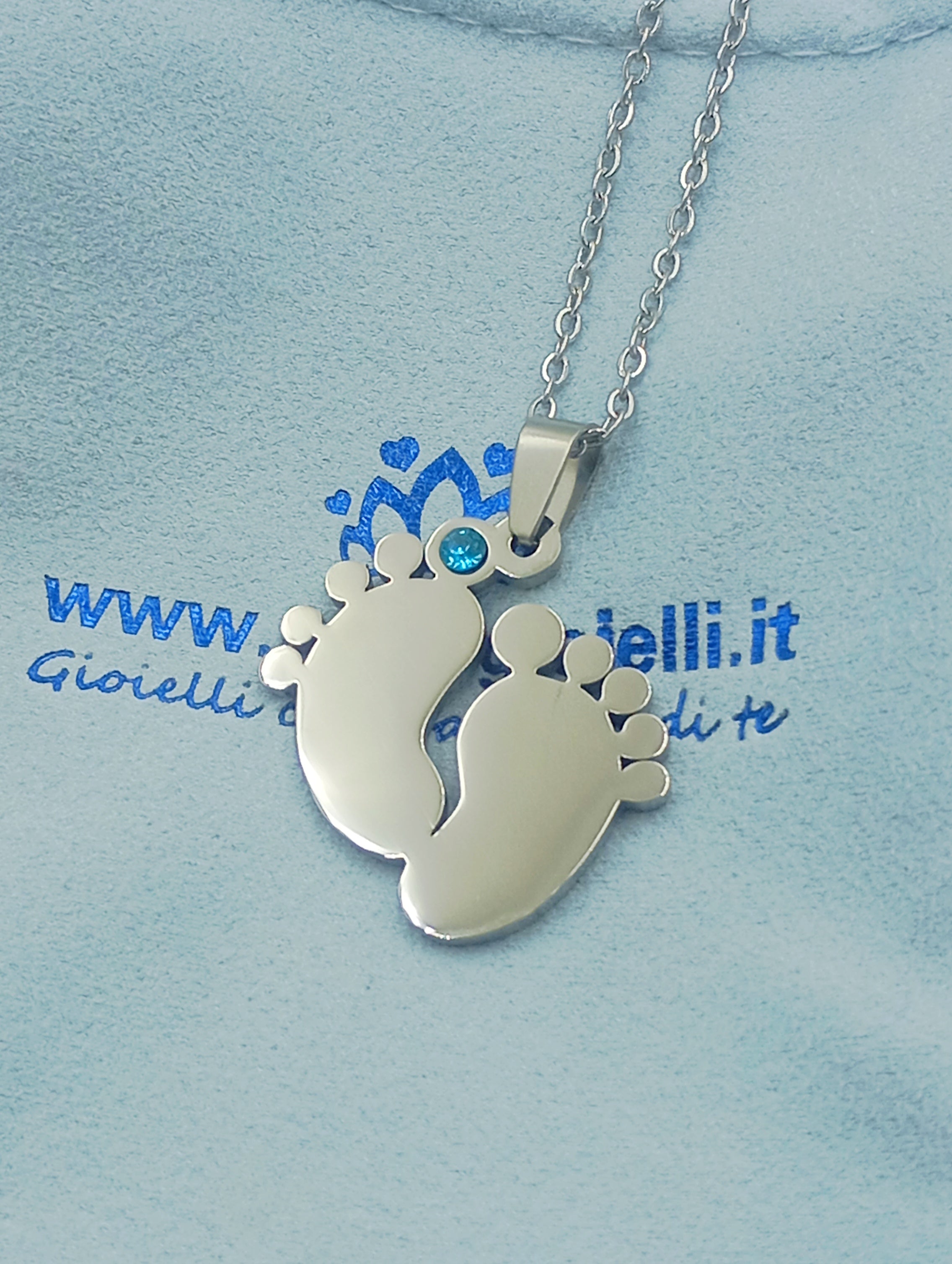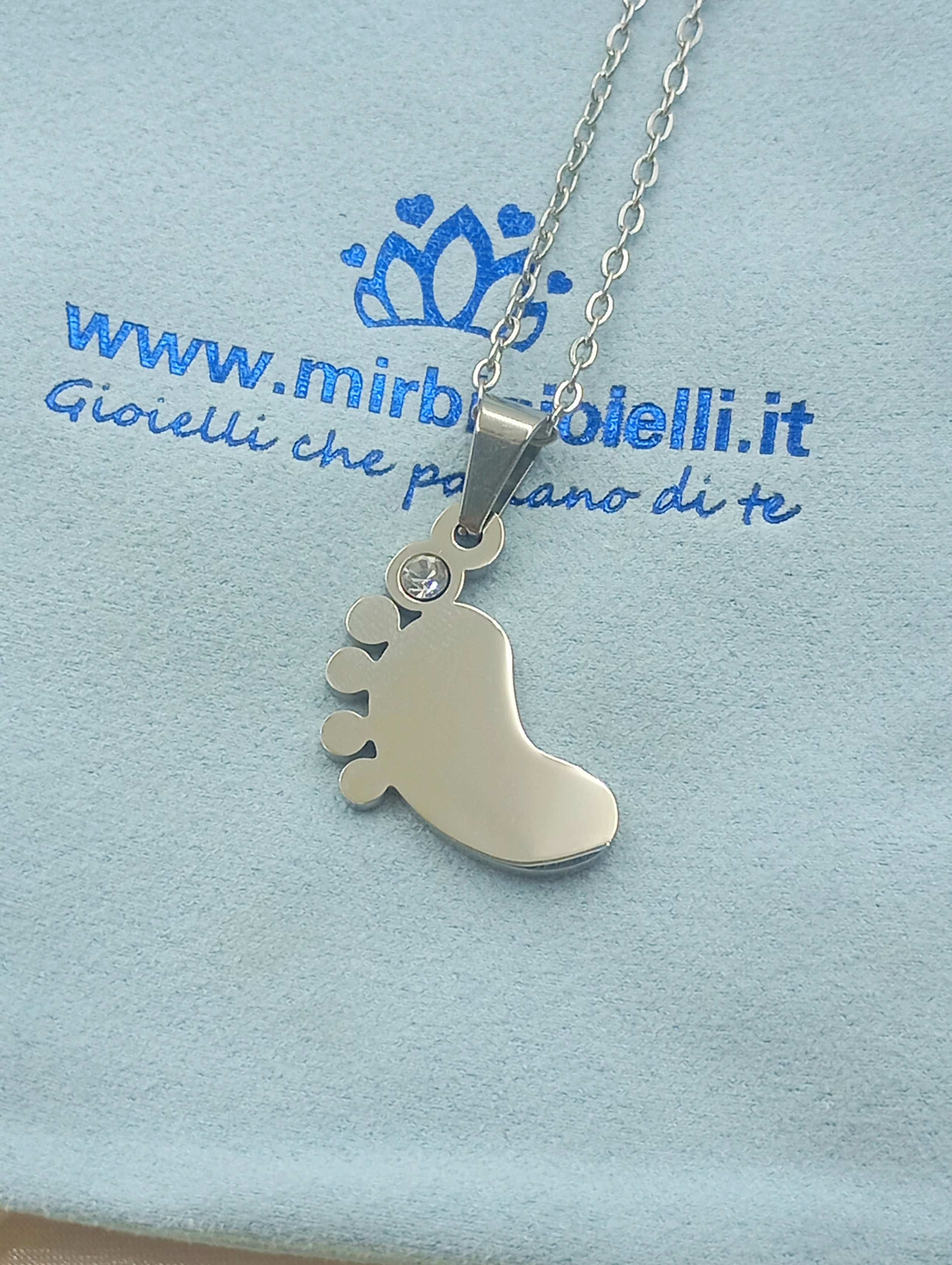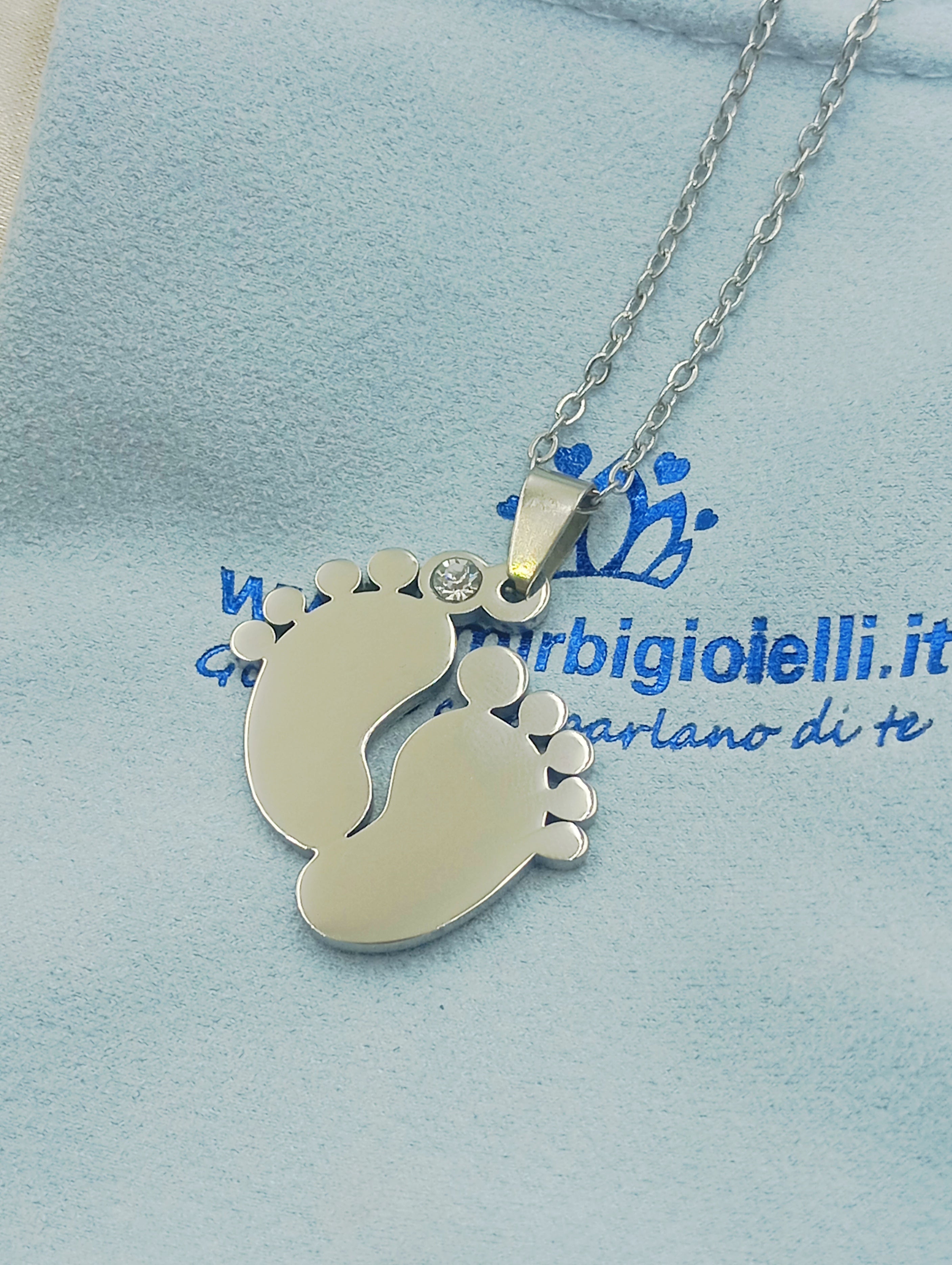 Collana in acciaio anallergico e inossidabile con ciondolo piedini, disponibili nella versione singola o doppia.