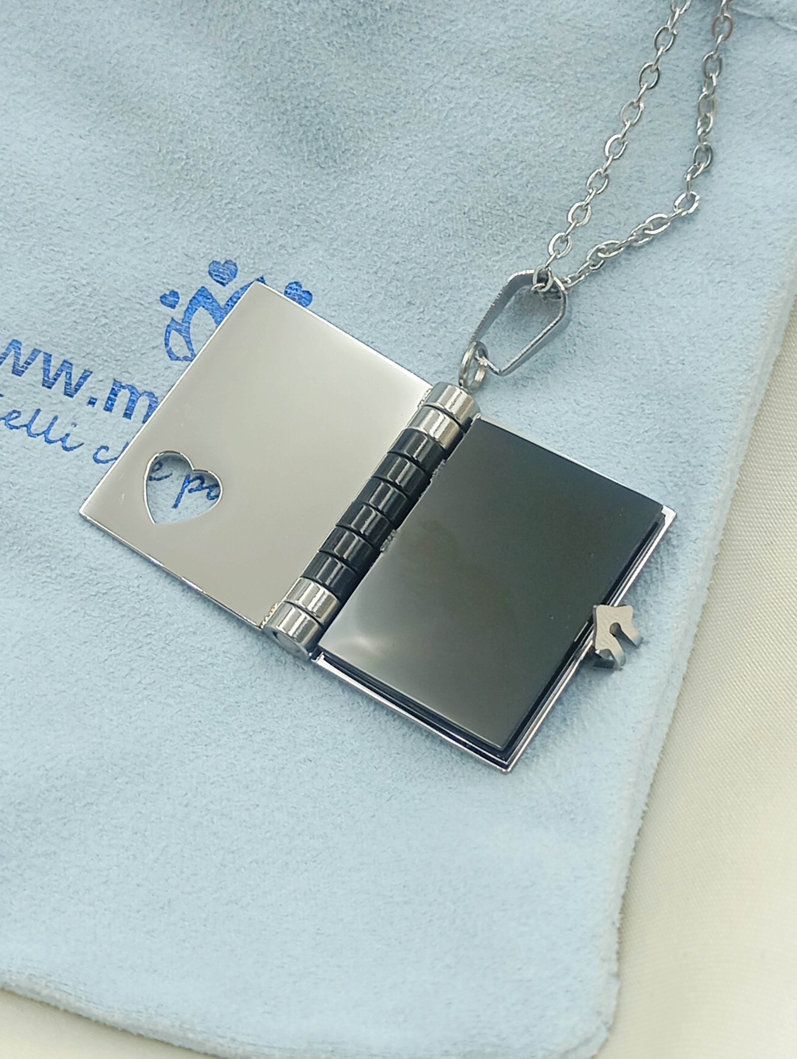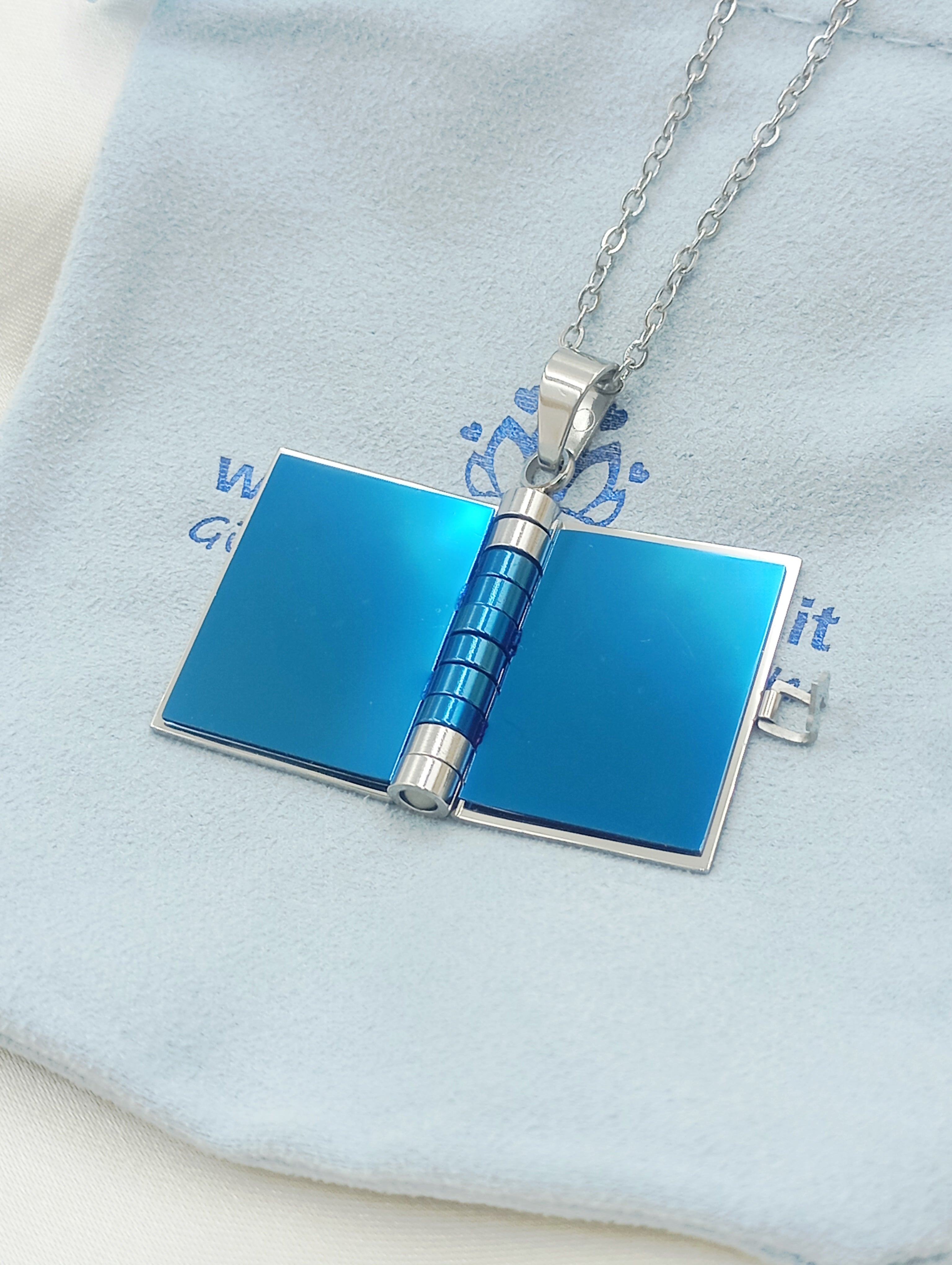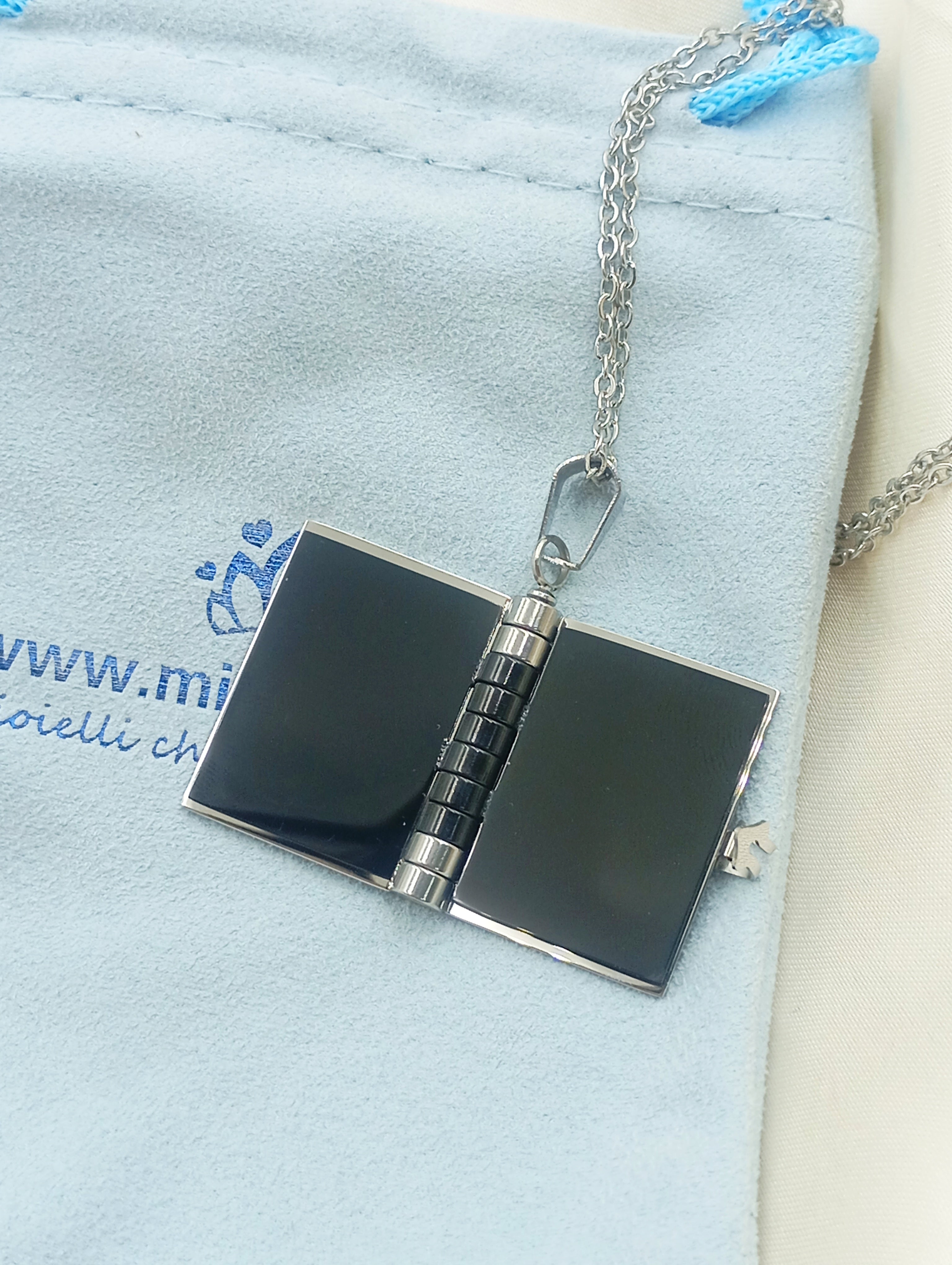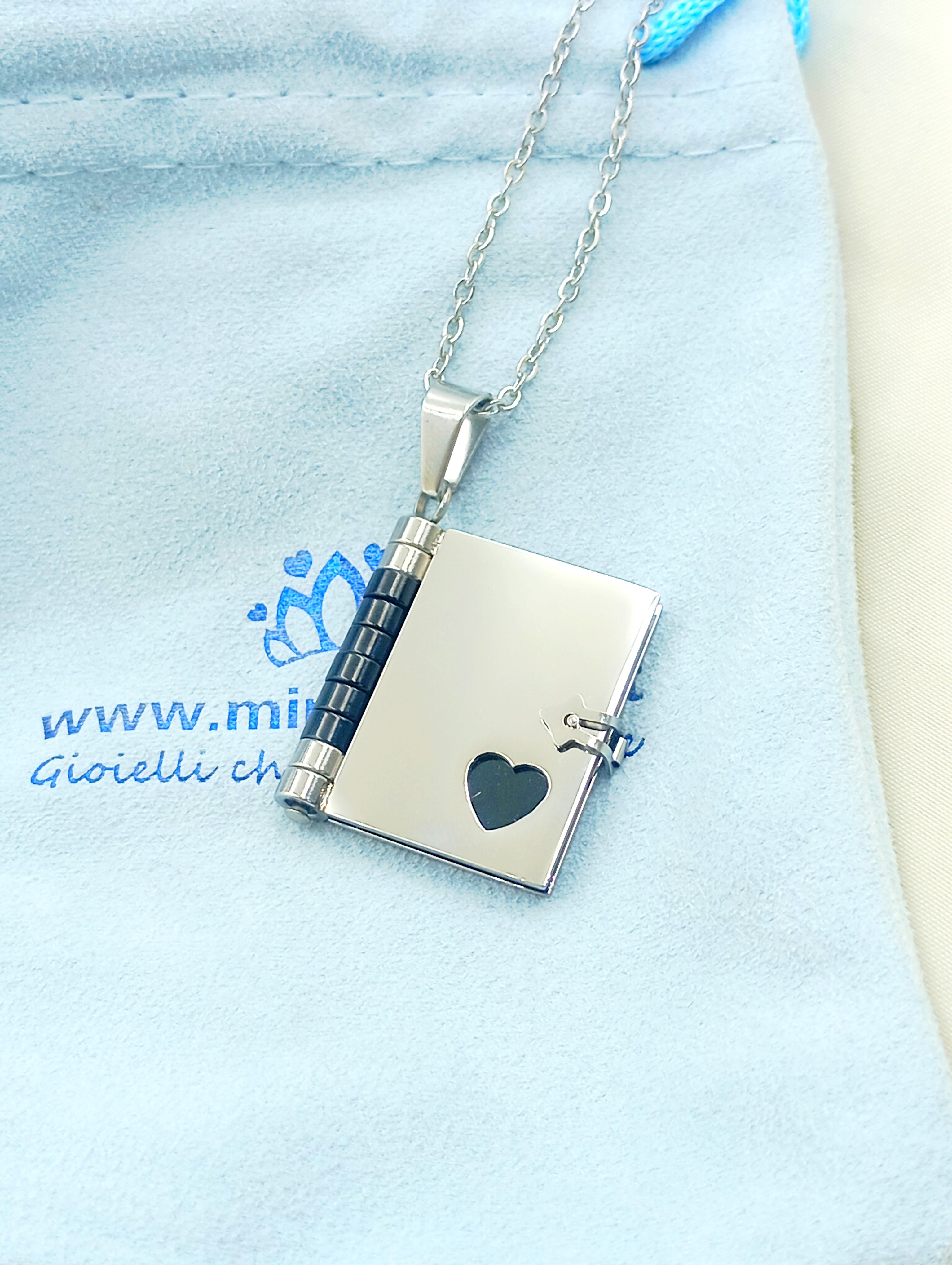 Collana con ciondolo a libro in acciaio inossidabile e anallergico. Il ciondolo si apre e all'interno troviamo tre pagine (6 facciate) personalizzabili con incisione.