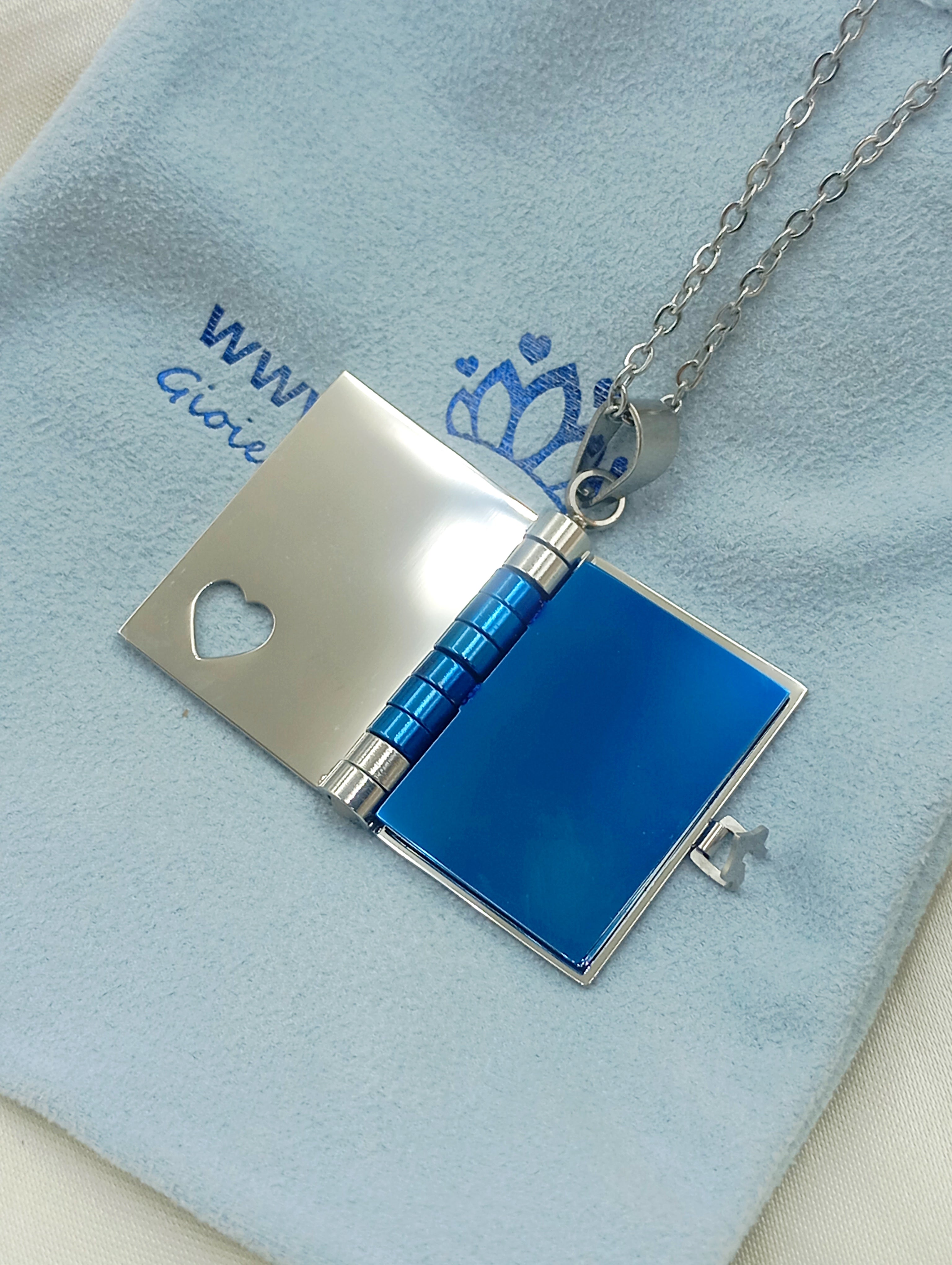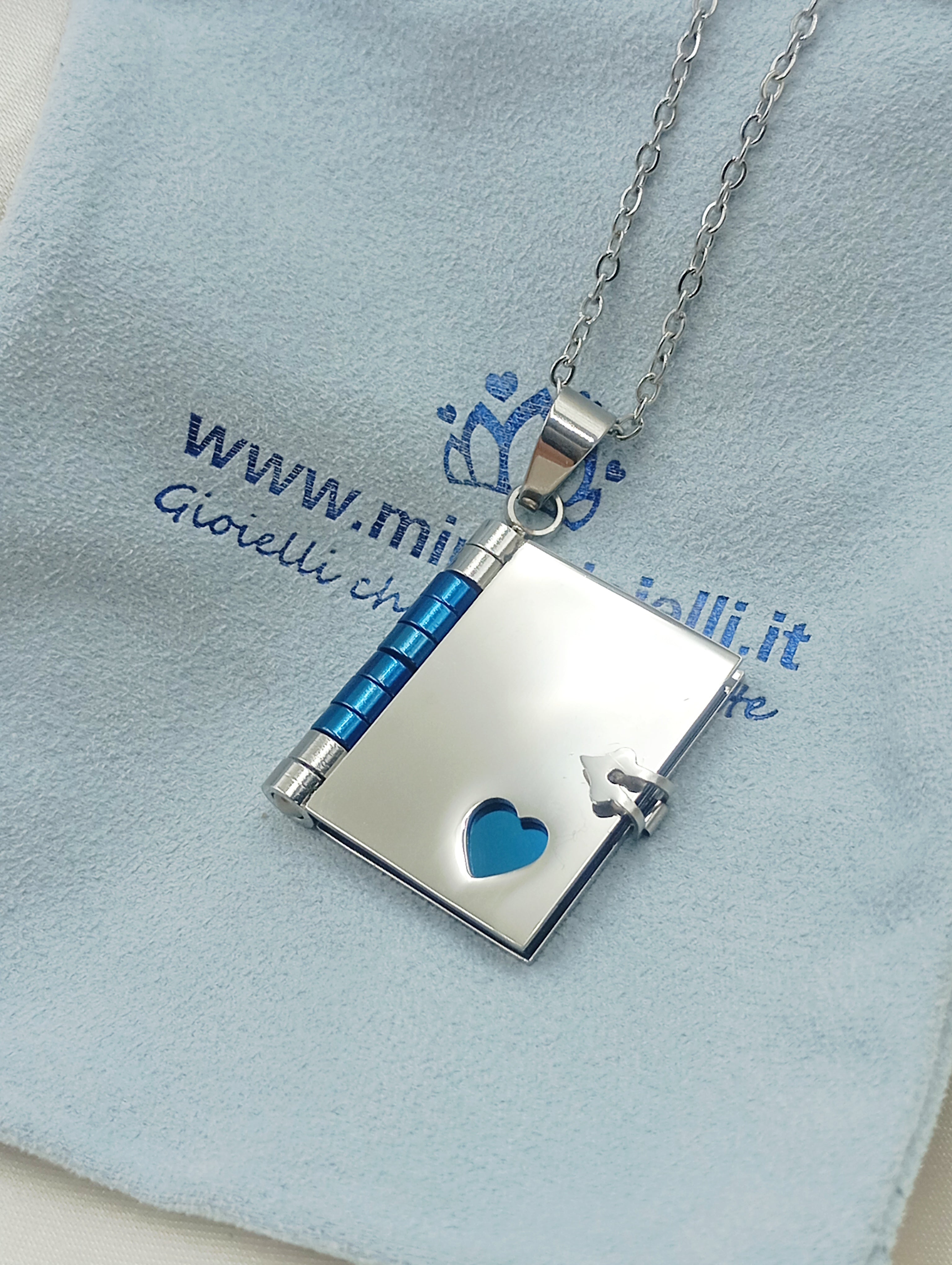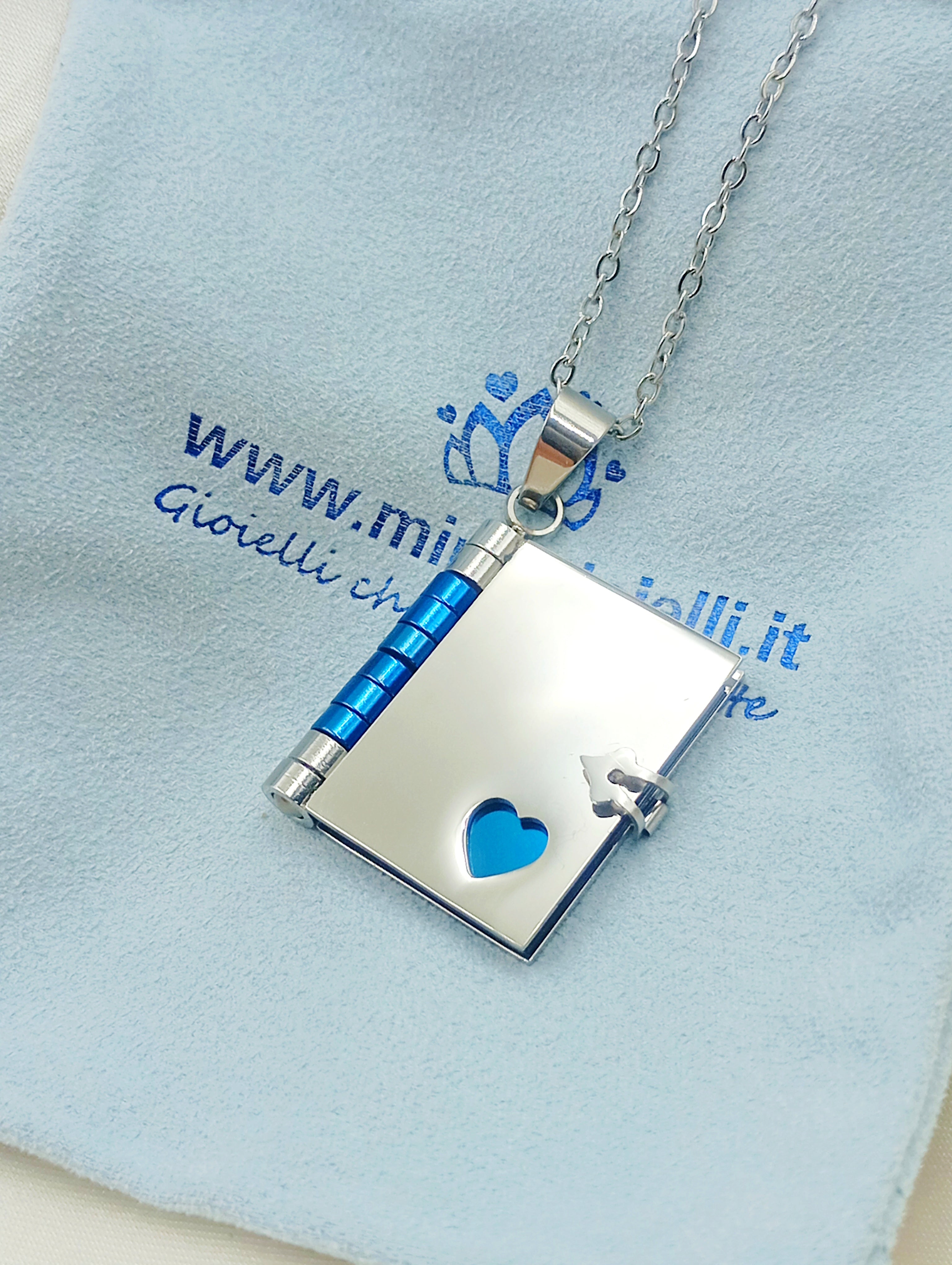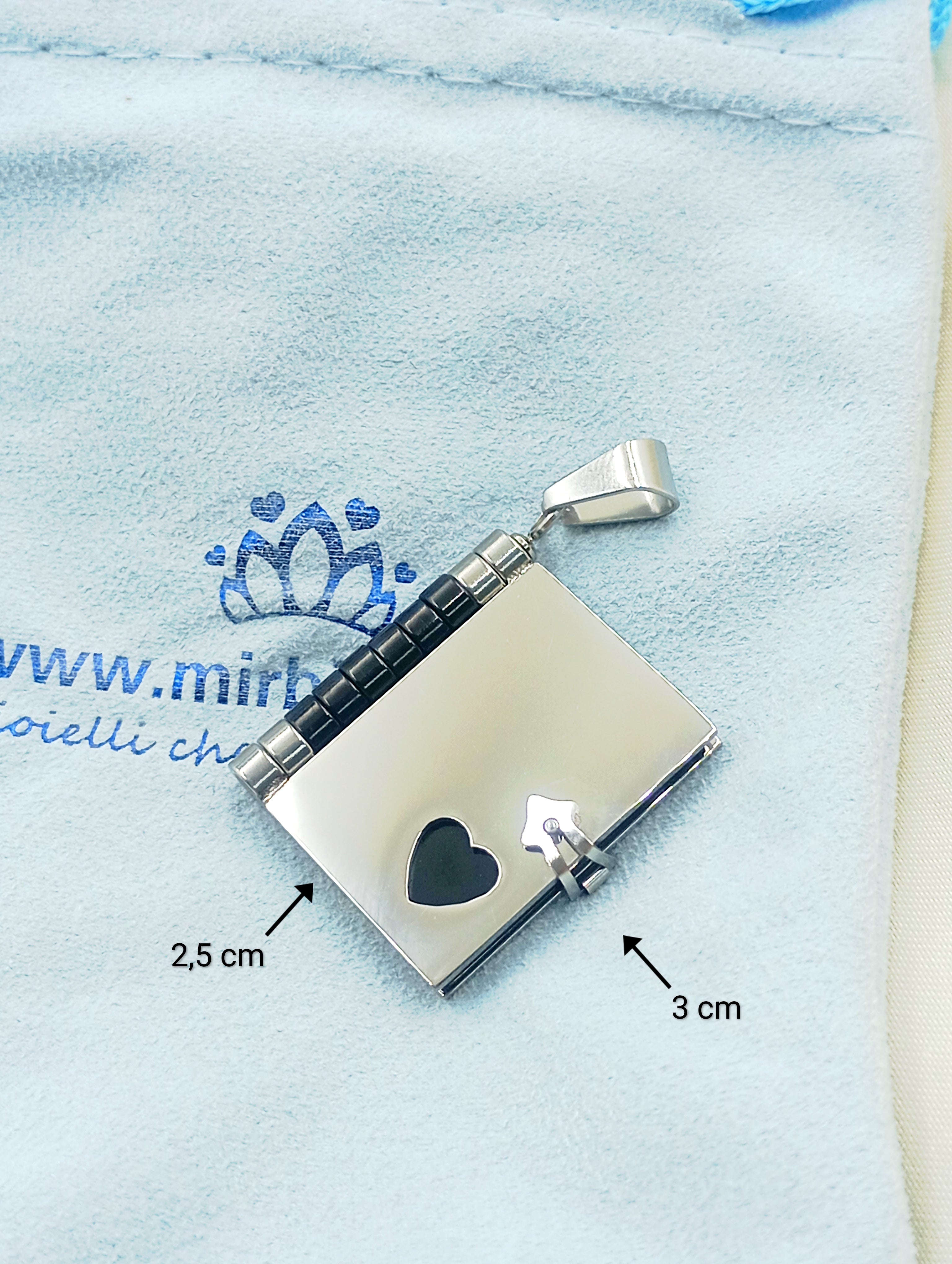 Collana con ciondolo a libro in acciaio inossidabile e anallergico. Il ciondolo si apre e all'interno troviamo tre pagine (6 facciate) personalizzabili con incisione.
