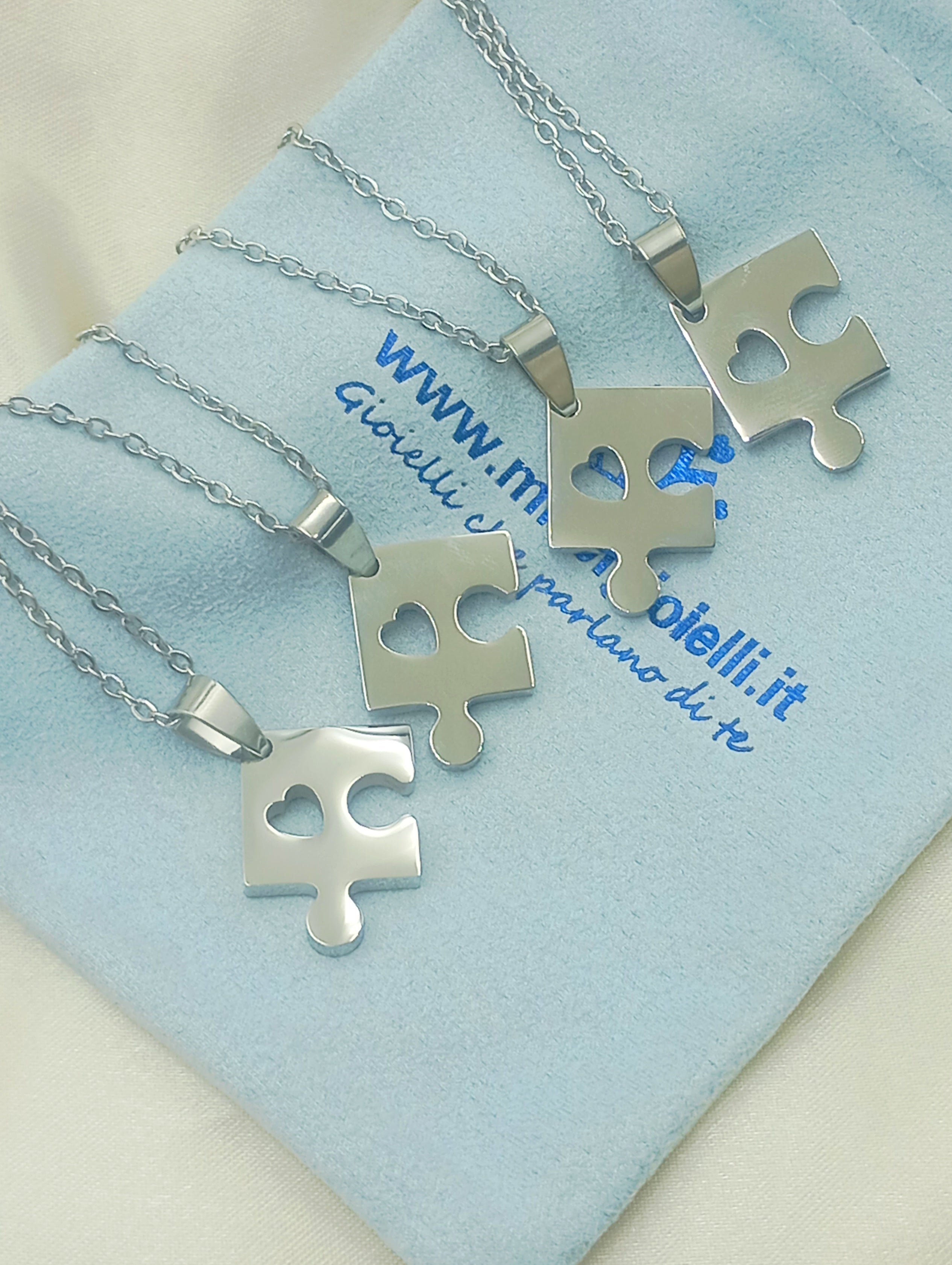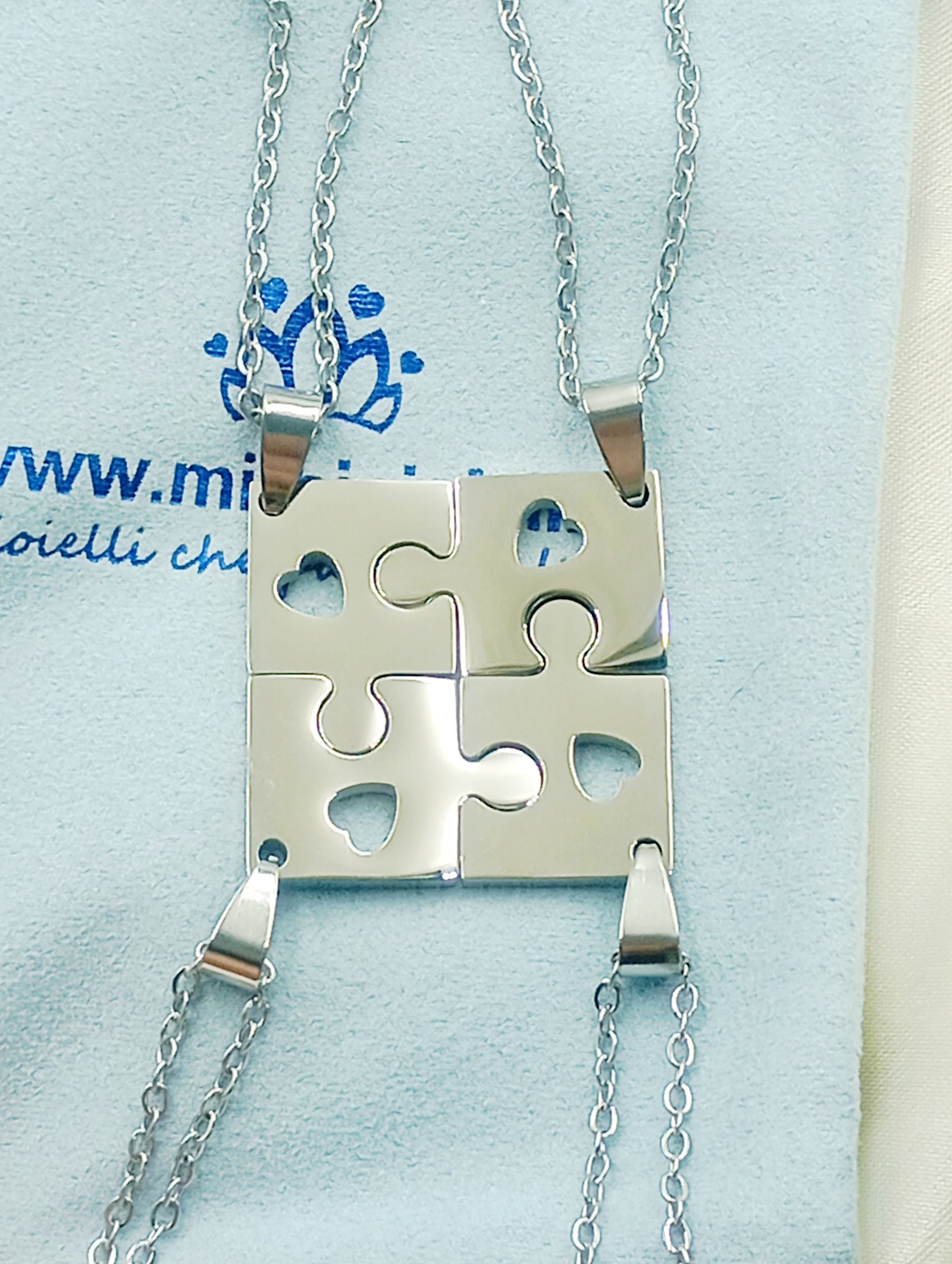 Set di quattro collane con quattro ciondoli in acciaio anallergico e inossidabile che si uniscono tra loro in un puzzle quadro.